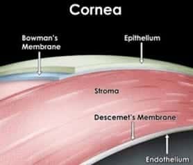 وتتكون القرنية أساسًا من طبقة خارجية تتجدد إذا جُرحت، و يمكننا تشبيه القرنية بالكتاب لأن لها غلافين أمامي وخلفي ، أما أوراق الكتاب فتمثل سمك القرنية .
